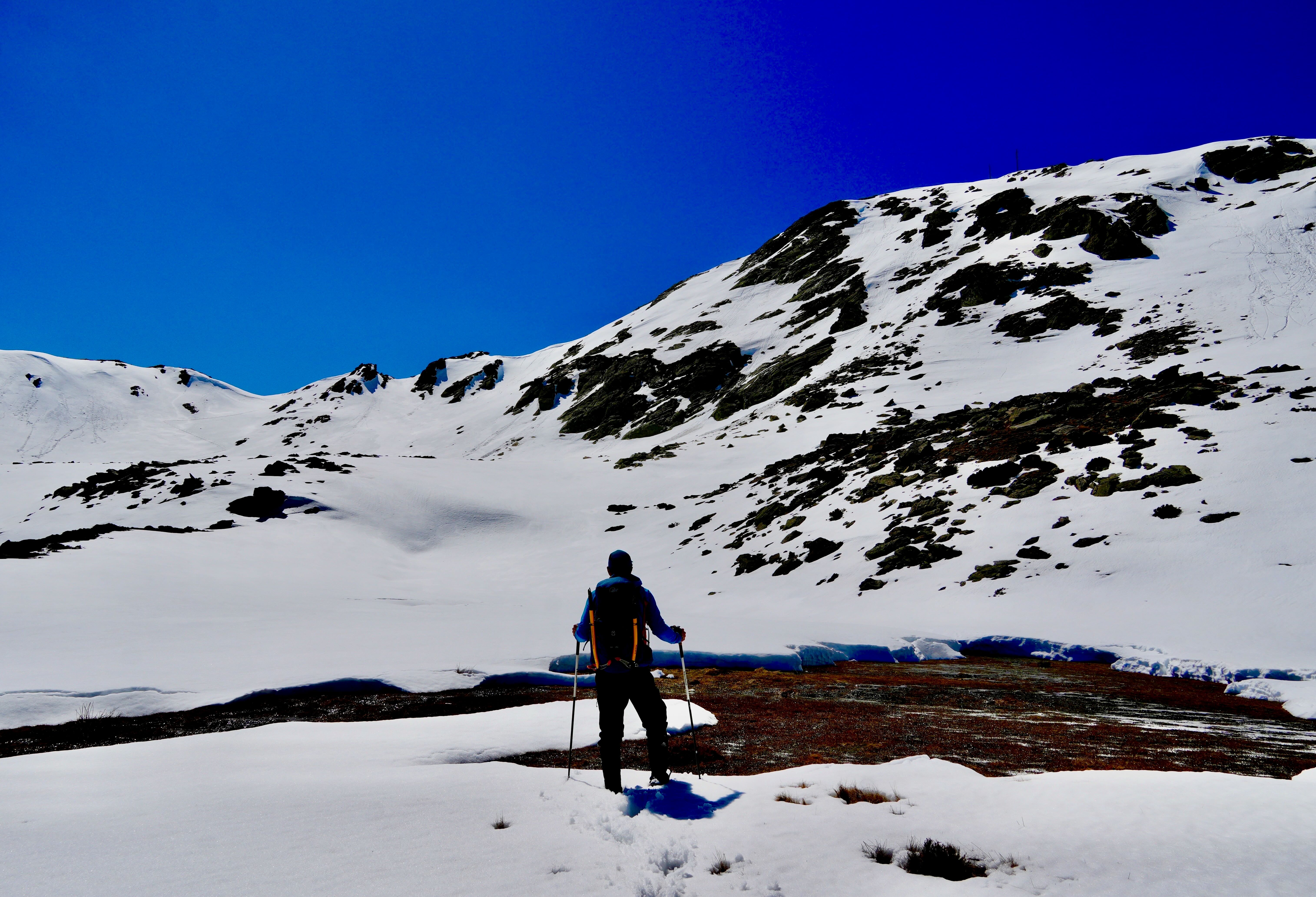 Al pie de la arista noreste del Pico del Lobo, que hay que rodear o nos toparemos con un talud difícil de bajar, nos topamos con el recién nacido Río Berbellido. Lo vadeamos e inmediatamente giramos a la derecha para subir hasta la Laguna de los Cantos (2111 m), anunciada por una baliza multicolor. Es pequeña y estacional, aunque suele aguantar hasta entrado el verano, y desde ella se tiene la mejor de las vistas de la escarpada cara este del Lobo y sus diferentes canales.